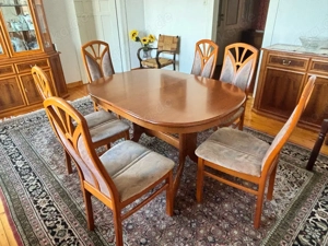 Verkaufe mein komplettes Esszimmer-Set aus hochwertigem Kirschbaumholz. Das Set besteht aus: Ausziehbarer Esstisch (129 cm, erweiterbar auf 175 cm) 8 passende Stühle mit gepolsterten Sitzen Vitrine mit Glasoberteil (138x52 cm, Höhe 221 cm) Sideboard (118x53 cm, Höhe 87 cm) Alle Oberflächen ...