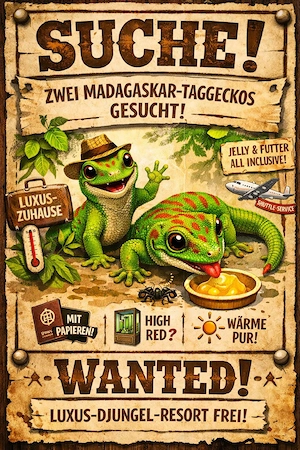 Gesucht: Zwei VIP-Geckos für Luxus-Dschungel! Hallo liebe Gecko-Butler und Reptilien-Manager, ich bin auf der Suche nach zwei Madagaskar-Taggeckos (gern Nachzuchten Jungtiere), die bereit sind, in ein kleines, aber feines Regenwald-Resort einzuziehen. Was euch erwartet: Ein bepflanztes ...