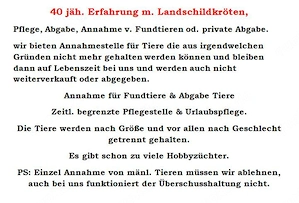 Landschildkröten private Aufnahme-Station. Ich habe seit 46 Jahren griech. Landschildkröte (ggf. auch Maurische) meine Tiere sind 46-1 Jahr alt, ein Tier ist in Dauepflege hier. Ich nehme auch Schildkröten zur Urlaubspflege bis zu 1. Monat (monatl. 20 Pflegegebühr pro Tier.) Wenn ich Platz habe ...