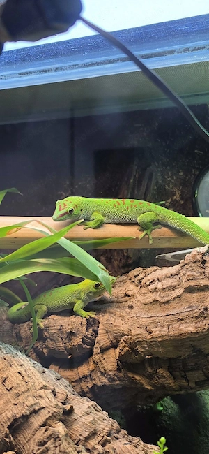 Wir geben unseren wunderschönen Madagaskar- Taggecko (Phelsuma grandis) in verantwortunqsvolle Hände ab Es handelt sich um ein Männchen und 2 w Weibchen aus einer Nachzucht, mit kräftiger grüner Färbung und leuchtend roten Zeichnungen, der ein echter Blickfang im Terrarium ist (siehe Bilder) Abgabe nur ...