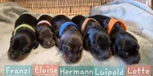 Liebevoll aufgezogene Dackelwelpen abzugeben 5 gesunde und zuckersüße Dackelwelpen haben am 08.03.26 das Licht der Welt erblickt. Rosa Halsband, Hündin in Wildfarben Braunes Halsband, Rüde in Black Tan Grünes Halsband, Rüde in Black Tan Oranges Halsband, Hündin in Black Tan Blaues Halsband, Rüde in ...