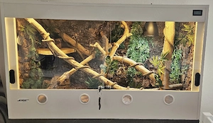 Zum Verkauf steht hier ein voll eingerichtetes Terrarium von der Firma Lucky Reptile. Es wurde aufwendig komplet innen mit Kork verkleidet und versiegelt. Die Größe ist: 100x50x60cm Ausstattung: - großes Heatpanel (Wärmeplatte) - 2 Led Lampen (Grundlicht) - 1 UVA UVB Lampe - Glasscheiben - Echtholz ...