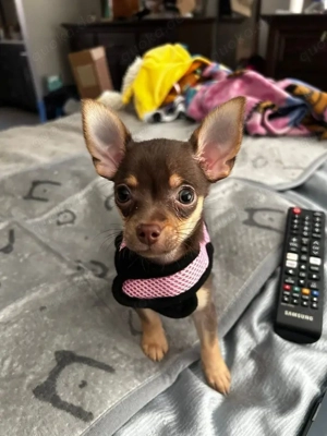 Unsere kleine Chihuahua Hündin Hazel wurde am 25.12.2025 geboren und ist jetzt etwa zwei Monate alt. Sie ist eine hübsche schokoladenfarbige Kurzhaar Chihuahua Hündin mit Tan Abzeichen und entwickelt sich ganz toll. Hazel ist vom Wesen her ruhig, sehr anhänglich und verschmust, aber natürlich auch welpentypisch ...