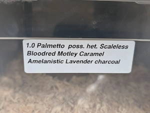 Ich gebe meine 0.1 Scaleless pied sided motlay ab Nz 5 2025 . Sie ist eine super fresserin und frisst problemlos Frost . Versand muss selbst organisiert werden.