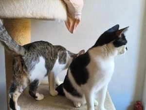 Ellen (weiß-schwarz) und Zora (weiß-grau getigert), geb. ca. 04 2025, kastriert, geimpft, entwurmt, gechipt, EU-Heimtierpass, negativ getestet auf FIV und FeLV Ellen & Zora wurden gemeinsam mit Tobi & John sowie Alis & Mickey (siehe ) in Rumänien in einem vermüllten Keller eines verlassenen Hauses geboren. ...