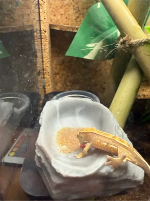 verkaufe ein Kronengecko Weibchen geschlüpft am 09. 2024 correlophus ciliatus sehr ruhige Wesen, wenn man sie auf die Hand nimmt, ist sie ganz entspannt und ruhig frisst Brei und Heimchen am liebsten Brei