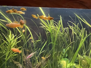 Junge Gold Molly aus eigener Nachzucht. Als Algenfresser geeignet. Am besten im Schwarm zu halten.