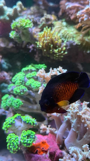Es wird ein sehr schöner und auffälliger Flammen-Zwergkaiser (dunkle bläuliche Farbvariante) in gute Hände abgegeben. Details: Auffällige dunkle bläuliche Farbgebung mit orangenen Akzenten Gesund, aktiv und sehr robust Frisst problemlos (Trocken- & Frostfutter) Tolles Verhalten im Riffbecken ...