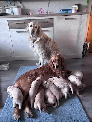 unsere Hündin Anni hat am 19. wunderschöne Golden Retriever Welpen geboren. Es sind 5 Jungs und 5 Mädels. Vater Yoshi, ebenfalls ein reinrassiger heller Golden Retriever Rüde wohnt wie auch die Mutter und die 10 kleinen bei uns im Haus mit Garten. Die Welpen wachsen mit allen möglichen Geräusche des ...