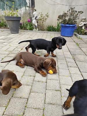 Unsere muntere Dackel-Bande ist bereit für das große Abenteuer eigenes Zuhause ! Wir suchen für ein bezauberndes Mädchen und drei charmante Jungs die passenden Lieblingsmenschen. Über die Kleinen: Alter: 4 Monate Geschlecht: 1 Mädel (dunkles Fell) & 3 Jungs (2 mit hellem Fell und einer mit dunklem Fell) ...