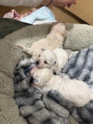Hallo! Vergangene Nacht ,am 17.2.26 haben unser zuckerschnuten 5Maltipoo,3Männlich und 2weiblich ,das Licht der Welt erblickt. Apricot Mädel Weiß gescheckt Junge Alle sind fit samt der Mama. Langsam werden sie munter. In 9Wochen mit der Erstimpfung,gechipt,Eu-Pass und natürlich mehrfach entwurmt dürfen ...