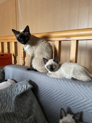 Fast 3 Monate alte Siam Katzen Zwei Mädchen und ein Junge Sie gehen aufs Katzenklo Kuscheln gerne Spielen gerne Essen Nassfutter und trockene Futter