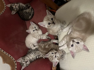 Zwei Crem tb. Point Katerle geb. 20.03.2026, suchen ab ca. Mitte Mai einen neuen Kuschelplatz. Sie sind von klein an den Menschen gewöhnt und wachsen Kreise der Familie auf. Bei Berufstätigkeit bitte nicht in Einzelhaltung. Auf Bild vier ist der Vater der Kleinen zu sehen.