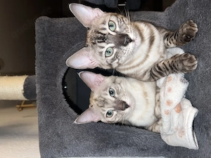 Hallo, Unsere beiden Bengal Katzen suchen ein neues und liebevolles Zuhause. Beide Weibchen sind am 12.6. geboren, sind kasteiet und geimpft (Impfausweis mit den jeweiligen nachwiesen sind für beide vorhanden). Sie zwei sind laute Geräusche und Kinder gewöhnt. Den Großteil sind sie total verspielt ...