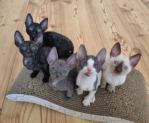 Zuckersüße Cornish Rex -Kitten aus championreicher Verpaarung. Sie kommen aus meinem liebevollen und zugelassenen Cornish Rex - Zucht. Frei zur Reservierung. Geboren am 04.03.2026 Abgabe wäre ab 12 Woche, ca. Mitte Juni 1-Katze - schwarz-tortie JASPER3- Kater - Blau 4- Kater - Schwarz 5-Kater ...