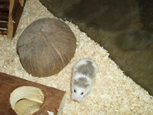 Roborowski Zwerghamster, Weibchen, gescheckt, 8 Wochen alt, mit großem Terrarium (80 cm lang) und großem Holz-Laufrad und Kletterhaus und Kokosnusshaus und Holz-Röhre und Trinknapf abzugeben. Privatverkauf unter Ausschluss der gesetzlichen Gewährleistung.