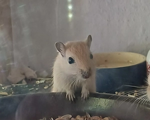 5 neugierig Rennmäuse am 15.3. 2026 geboren, dürfen nun bald ausziehen. Sie wachsen mit Mama und Tanten auf und sind bereits futterfest und trinken schon aus der Flasche oder Schale. 3x Algierfuchs 1x Agouti 1x Schwarz. Bei Interesse einfach mal anrufen.