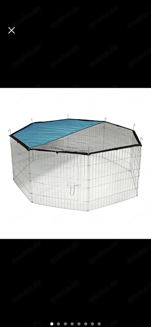 Ich biete ein praktisches, achteckiges Freigehege mit einem blauen Sonnenschutzdach.