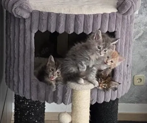 Wir suchen für unsere lieben Maine Coon Kitten ab dem 01.04.2026 ein schönes Zuhause auf Lebenszeit. Die Mama wiegt 4,5 kg und der Papa 10 kg. Auf den letzten beiden Bildern sind die Elterntiere zu sehen. Die Kleinen und ihre Mutter wachsen mitten bei uns in der Familie auf. Sie kennen Hunde, alle ...