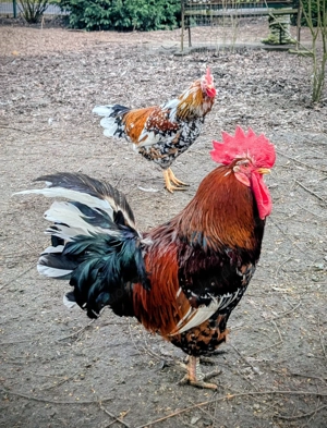Ein sehr freundlicher, bunter Junghahn sucht einen neuen Wirkungskreis. Schlupf war September 2025 Auf den Bildern ist auch unser Ole, der Althahn und Vater zu sehen, der nicht zur Abgabe steht. Die Elterntiere sind nicht blutsverwandt