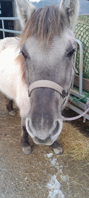 Liebes Pony sucht neues Zuhause. Thyra 18 Jahre alt, Tarpan (Rasse). Stockmaß 1,33m Aktuell im Offenstall mit 4 Stuten, Rang niedrieg. Frisch geimpft, Dezember 2025 entwurmt. Hufe wurden 11.03.26 ausgeschnitten. Reitbar, eher im Gelände wie in der Halle.