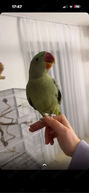 Wir verkaufen unsere große Alexandersittich-Dame Dora . Sie ist ca. 10 Monate alt und hat noch ein paar Babyfedern an den Flügeln. Sie ist handzahm, kommt gerne zum fressen auf die Hand und lässt sich herumtragen. Gestreichelt werden möchte sie nur selten, aber ich denke, das kommt noch mit der Zeit, ...