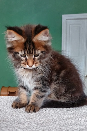 Bezaubernder, drei Monate alter Maine-Coon-Kater sucht ein liebevolles Zuhause. Er ist ein wunderschöner Maine-Coon-Kater mit elegantem, harmonischem Erscheinungsbild und einem ruhigen, selbstbewussten Wesen. Sein schwarz-marmoriertes Fell hat einen satten, warmen Farbton mit einem klar definierten ...