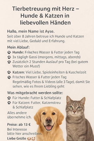 Hallo, mein Name ist Ayse. Seit über 8 Jahren betreue ich Hunde und Katzen mit viel Liebe, Geduld und Erfahrung. Mein Ablauf: Hunde: Frisches Wasser & Futter jeden Tag 3x täglich Gassi (morgens, mittags, abends) Zusätzlich 2 Stunden Auslauf pro Tag (bei gutem Wetter ein Muss!) Katzen: ...