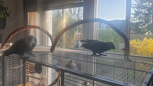 Timneh Graupapageien beide über 20 Jahre alt sind beide beringt, sind kein Paar tolerieren sich jedoch wenn sie sich ausweichen können. Beide Flugunfähig , sie sind beide nicht zahm , nehmen Futter aus der Hand und wenn sie doch mal unfreiwillig auf dem Fußboden gelandet sind kommen sie auf die Hand ...