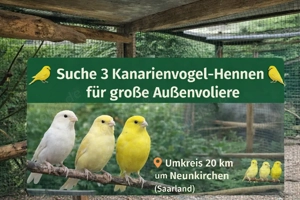 Ich suche 3 Kanarienvogel-Hennen für meine große Außenvoliere. Meine Vögel leben ganzjährig in einer geräumigen, artgerechten Außenvoliere und würden sich über weibliche Gesellschaft freuen. Nur im Umkreis von 20 km um Neunkirchen (Saarland). Abholung selbstverständlich möglich. Bitte gerne mit ...