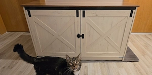 Verkaufe Katzenklo-Schrank Hzuaneri wegen Umstieg auf ein automatisches Katzenklo. Zustand sehr gut, Maße 60 50 54 cm, Farbe Rustic White & Bronze. Praktisch in der Nutzung: versteckt das Katzenklo, hat eine Tür für einfache Reinigung und seitlichen Eingang für die Katze. Kann auch als Möbel Beistelltisch ...